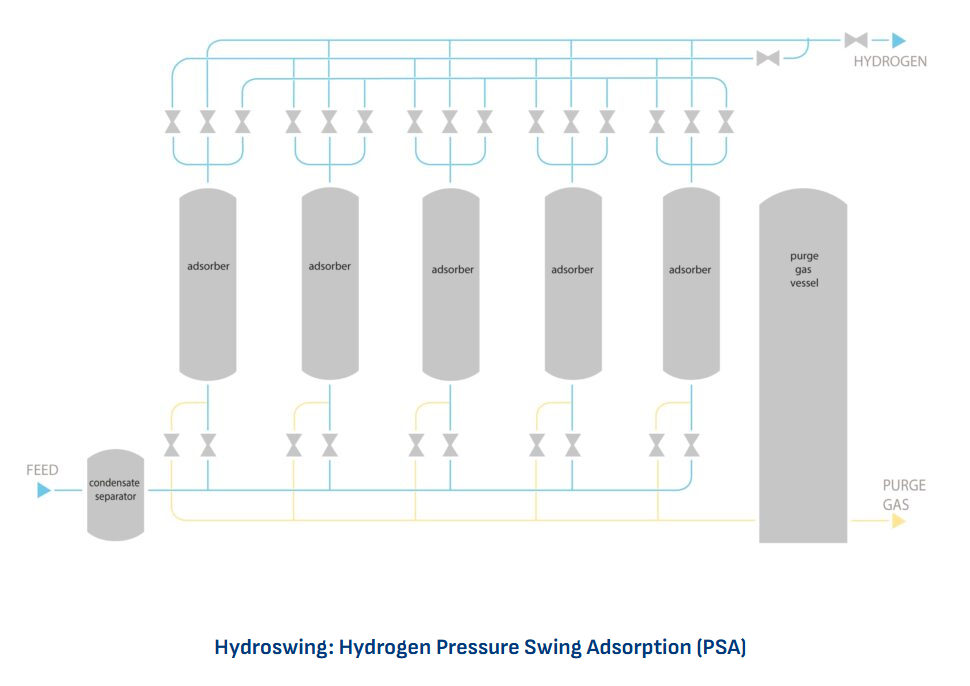 HYDROSWING 공정은 다층 흡착식 가스 분리(multibed pressure swing adsorption, PSA) 기술을 기반으로 합니다. 수소를 포함하고 있는 공급 가스의 흐름에서 CO, CO₂, CH₄ 및 N₂와 같은 불순물을 선택적으로 흡착하여 정제합니다. 그 결과, 최대 90%의 회수율로 고순도 수소가 자동적으로 연속 생산되며, 별도의 작업자 개입이 필요 없습니다.